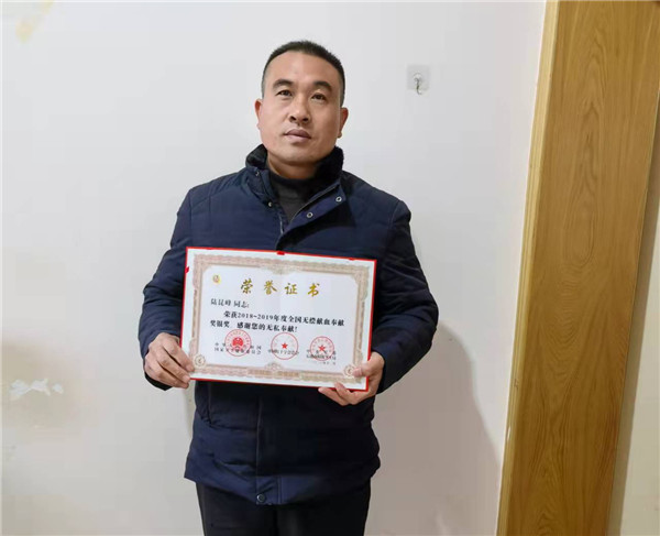 今年11月16日,陆昆峰获评“2018~2019年度全国无偿献血奉献奖银奖”。“只要我身体允许,我会一直坚持下去,一直到我不能献血为止。”看着手中的荣誉证书,陆昆峰满脸自豪地说。