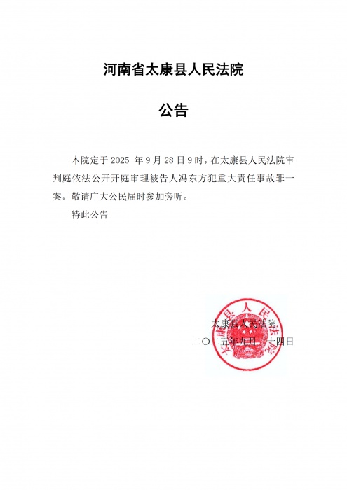 太康县人民法院关于被告人冯东方重大责任事故罪一案的开庭公告