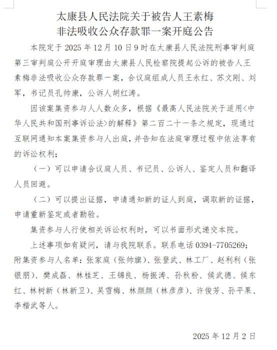 太康县人民法院关于被告人王素梅非法吸收公众存款罪一案开庭公告
