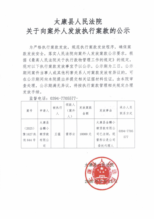 太康县人民法院关于向案外人发放执行案款的公示
